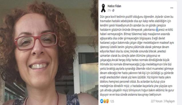 Zonguldak Ereğli Devlet Hastanesi Anestezi ve Reanimasyon Uzmanı Dr. Hatice Fidan, corona testinin pozitif çıktığını sosyal medya hesabından duyurdu. Fidan yaptığı paylaşımda ne kadar zorlu bir süreçten geçtiğini şu ifadelerle anlattı: