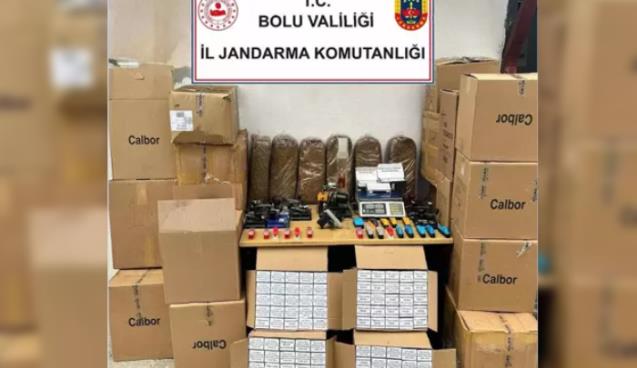 Bolu İl Jandarma Komutanlığı Kaçakçılık ve Organize Suçlarla Mücadele Şube Müdürlüğü ekipleri, kaçak tütün ürünleri bulunduğunu tespit ettiği şüphelinin ev ve işyerine baskın yaptı. Jandarma ekipleri tarafından yapılan aramada 1 adet sanayi tipi makaron doldurma makinesi, 1 adet hassas terazi, 11 adet kollu manuel makaron doldurma makinesi ve 25 adet makaron doldurma aparatının yanı sıra 22 bin 500 adet sigara sarma kağıdı, 29 bin 300 adet içi tütünle doldurulmuş makaron, 101 bin 200 adet bandrolsüz boş makaron ile 69 bin adet sahte bandrollü boş makaron, 131 kilogram kıyılmış tütün, 10,5 kilogram nargile tütünü, 670 adet makarondan koparılmış ve kopyalanmaya hazır bandrol ile 1 adet faturasız kurusıkı tabanca ele geçirildi. Olayla ilgili 2 şüpheli hakkında yasal işlem başlatıldı.