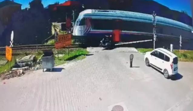 Zonguldak'ın Çaycuma ilçesinde, hemzemin geçitte trene çarpan motosikletin sürücüsü S.D. hafif yaralandı. Kaza, güvenlik kamerasına yansıdı.