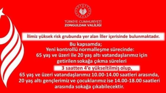 Zonguldak Valiliği Zonguldak'ın yüksek risk grubunda olması nedeniyle 65 yaş ve üstü ile 20 yaş ve altı gruba yeni düzenlemeler getirdi. Valilikten yapılan duyuruda 65 yaş ve üstü ile 20 yaş ve altı grubunun sokağa çıkma yasağı 3 saatten 4 saate çıkarıldı.
