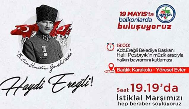 Zonguldak Ereğli Belediye Başkanı Halil Posbıyık, 19 Mayıs Atatürk’ü Anma, Gençlik ve Spor Bayramı’nda müzik aracı üzerinden halkın bayramını kutlayacak. Saat 19.19’da balkonlarından ve pencerelerinden halkın katılımıyla hep birlikte İstiklal Marşı okunacak. Belediye hoparlörlerinden İstiklal Marşı tüm Ereğli’de yankılanacak.