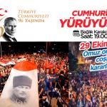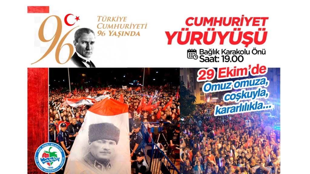 Türkiye Cumhuriyeti’nin 96’ncı yılında Kdz. Ereğli Belediyesi tarafından ‘Cumhuriyet Yürüşü’ gerçekleştirilecek. Bağlık Polis Karakolu önünden saat 19.00’da başlayacak olan yürüyüş, Atatürk Anıtı önünde son bulacak.