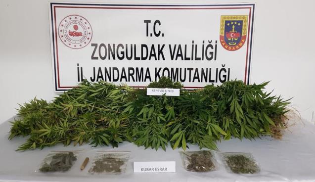 Zonguldak İl Jandarma Komutanlığı ekiplerince yapılan istihbari çalışmalarda D.C. isimli şahsın izinsiz kenevir bitkisi yetiştirdiği bilgisini alan ekipler şüpheli D.C.’nin Alaplı İlçesi Fındıklı Köyü’ndeki evine baskın düzenledi. Yapılan aramalarda, 50 gram kubar esrar ve 31 kök kenevir bitkisi ele geçirildi. D.C. isimli şahıs jandarma ekiplerince gözaltına alındı.