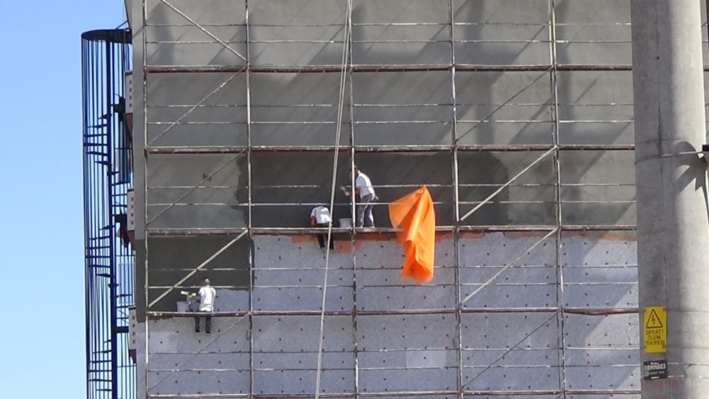 İlçeye bağlı Sarıkorkmaz Mahallesi Şehit Er Kudret Özcan Caddesi üzerinde 9 katlı binanın mantolama sıvasını yapan 3 işçinin hiçbir güvenlik önlemi almadan çalışması kameralara yansıdı. Katın sıvasını bitiren işçiler bir alt kata ise iskelenin demirlerinden adeta ölüme meydana okuyarak indi. Yaklaşık 25 metre yükseklikte emniyet kemeri olmadan ve hiçbir koruma malzemesi kullanmadan çalışan işçilerin bu hareketleri yürekleri ağızlara getirdi.