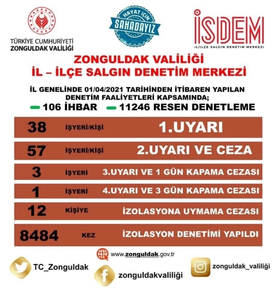 Zonguldak Valiliği İl genelinde Corona Virüs salgını ile mücadele kapsamında yapılan günlük ve haftalık tematik denetim sonuçlarını açıkladı.