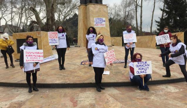 Bu arada, İlçedeki Kadın Platformu üyesi bir grup kadın da, Atatürk Anıtı önünde tepki eyleminde bulundular.Ellerinde, üzerlerinde ‘İstanbul Sözleşmesinin Feshine” yönelik tepkiler içeren dövizlerle Anıt önünde açıklama yapan kadınlar da, “Değil gece yarısı kararnamesi, yeri yarsanız, göğü başımıza geçirseniz haklarımızdan da hayatlarımızdan da vazgeçmeyeceğiz. Haklarımızın ve hayatlarımızın teminatı olan İstanbul Sözleşmesini savunacağız. İstanbul Sözleşmesi bizimdir, vazgeçmeyeceğiz” diyerek, alınan kararı protesto ettiler.