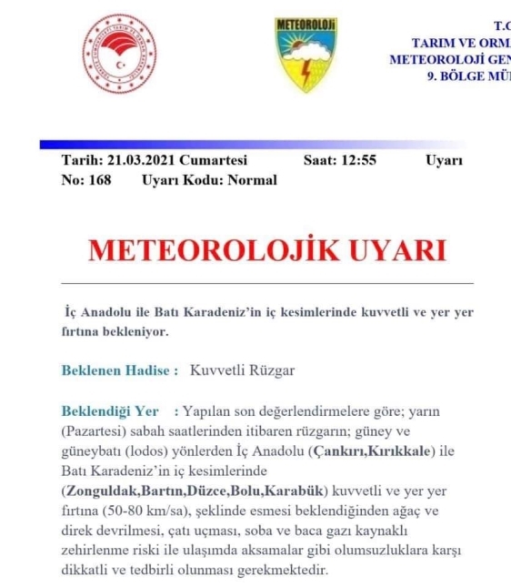 Meteoroloji Genel Müdürlüğü’nden yapılan açıklamaya göre Zonguldak’ta kuvvetli fırtına beklendiği belirtildi. Batı Karadeniz’in iç kesimlerinde kuvvetli ve yer yer fırtına beklendiğinden vatandaşlar; ağaç ve direk devrilmesi, çatı uçması, soba ve baca gazı kaynaklı zehirlenme riskine karşı uyarıldılar.