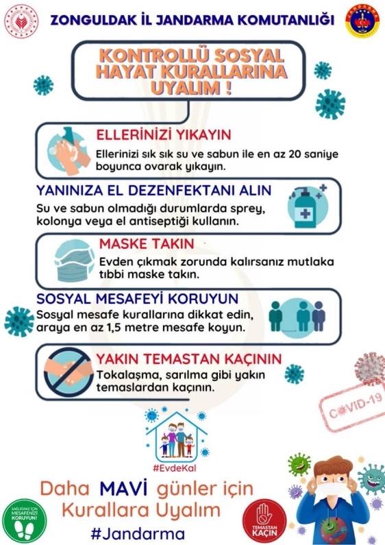 Zonguldak il Jandarma Komutanlığı ‘kontrollü sosyal hayat kurallarına uyalım’ uyarısı yaptı. Corona Virüs salgının sürecinin henüz bitmediğine dikkat çekilirken, ‘Ellerinizi yıkayın, yanınıza el dezenfektanı alın, sosyal mesafeyi koruyun, maske takın ve yakın mesafeden kaçının