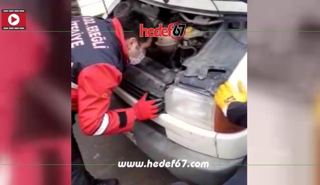 Olay ilçeye bağlı Sarıkorkmaz Mahallesi Eski İtfaiye Caddesi üzerinde meydana geldi. Alınan bilgilere göre Hafif ticari kamyonet sürücüsü aracına bindiği sırada motor kısmında kedinin sesini duydu. İlk etapta kendi imkânları çıkarmaya çalışsa da bunda başarılı olamayınca İtfaiye ve Zabıta ekiplerine haber verdi. Olay yerine gelen İtfaiye ekipleri kediyi motor kısmından çıkartmak için çalışma başlattı. İtfaiye erleri kedi sesi çıkararak başladıkları çalışmada kedi motor kısmının altından çıkarak kaçmaya çalıştı. Kediyi yakalayan itfaiye ekipleri bakım ve tedavisi için kediyi Ereğli belediyesi hayvan barınağına götürdü. O anlar cep telefonu ile görüntülendi.