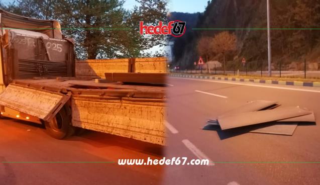Olay 19.30 sularında Alaplı Ereğli karayolu Göktepe altı mevkiinde meydana geldi. Alınan bilgilere göre TIR üstünde ki dilim saclar virajda dorseden kayarak çevreye savruldu. Yolun boş olması sebebiyle herhangi bir başka kaza yaşanmazken, yola savrulan saclar karşı şeritten ilerleyen baska bir TIR'ın ise lastiğinin patlamasına neden oldu. Yola savrulan saclar trafik ekiplerinin yolu kapatmasının ardından forklift ile toplanarak TIRa yüklendi.
