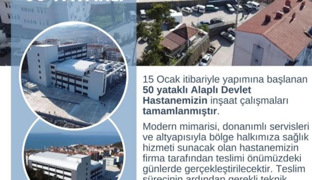 Milletvekili Bozkurt, “Teslim sürecinin ardından gerekli teknik kontrollerin ve donanım kurulumlarının tamamlanmasıyla birlikte, Alaplı Devlet Hastanemiz kısa süre içinde hizmet vermeye başlayacaktır. Bölgemizin sağlık altyapısına önemli bir katkı sağlayacak bu yatırımın Alaplı’mıza hayırlı olmasını diliyorum.” ifadelerini kullandı.