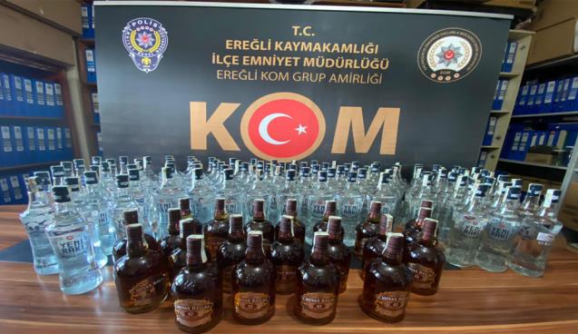 Karadeniz Ereğli İlçe Emniyet Müdürlüğü KOM grup amirliği tarafından yapilan operasyonda Sinan T. isimli şahsın kendisine ait aracı ile ilçeye kaçak alkol getireceği ihbarını aldi. Akşam saatlerinde araci durduran KOM ekipleri koliler halinde;