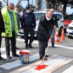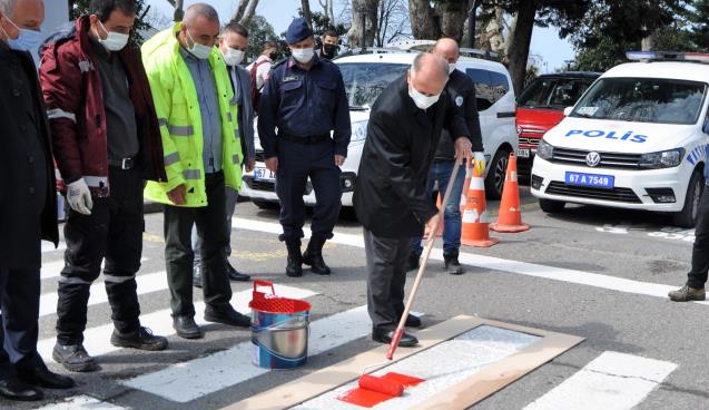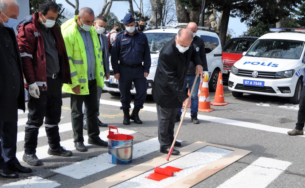 Karadeniz Ereğli’de, İçişleri Bakanlığı genelgesi doğrultusunda, yaya geçitlerinde bulunan beyaz şeritlerden ortadaki şerit sembolik olarak kırmızıya boyanarak ’’Yaya Önceliği Kırmızı Çizgimizdir’ mottosu ile ’’Yaya Önceliği’’ konusuna dikkat çekildi.