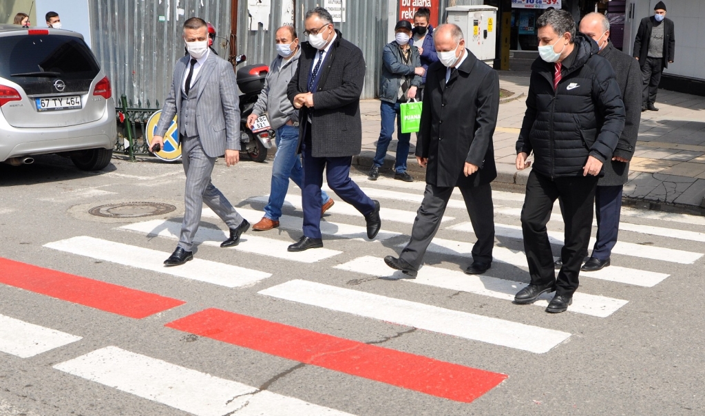 Kdz Ereğli Kaymakamı İsmail Çorumluoğlu Emniyet Müdürü Hakan Çelik, Jandarma Komutanı Bayram Dündar’ın katıldığı etkinlikte, yaya geçidindeki beyaz çizgilerden bir tanesi kırmızıya boyanarak yaya önceliği konusuna dikkat çekildi. Kaymakam İsmail Çorumluoğlu, etkinliğin ardından yaptığı açıklamada, yaptıkları çalışmanın amacının yayaların öncelikli olduğunu belirtmek dedi. Çorumluoğlu yaptığı açıklamasında şunları söyledi: “Daha önce de yayalara öncelik verilmesi çalışmalarımız oldu. Covid nedeniyle trafik çalışmalarında belki biraz kopmalar oldu. Ereğli’ye ilk geldiğimde yayalara daha fazla öncelik veriliyordu. Ama üzülerek görüyorum ki şu anda vatandaşımız biraz daha acele gidip acele gelmeye çalışıyor. Bugünkü çalışmamızın mottosu şudur. ‘Yayalarımızın öncesi kırmızı çizgimizdir’. Yayalar önceliklidir bunun anlamı bu. Renk farklılığından dolayı sürücülerimiz bunu daha rahat görecekler. Bazı yerlerde beyaz boyalarda azalmalar, çıkmalar oluyordu, sürücülerimiz görmekte zorlanıyordu. Belediyemiz sağ olsun, bu eksikliği gidermiş oldu. Hafta sonları ve akşamları belediyeden bu çalışmayı yapmalarını rica ettim. Havalar açıldığı tarihten itibaren bu boyama çalışmalarımız devam edecek.”