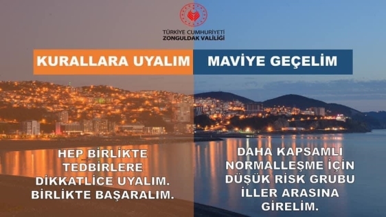 Zonguldak Valiliği Corona Virüs salgın sürecine ilişkin Zonguldak görseli üzerine ‘kurallara uyalım riskli görünen turuncu renkten çıkıp maviye geçelim’ şeklinde dikkat çekici paylaşım yaptı.
