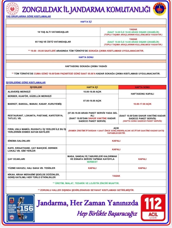 Zonguldak İl Jandarma Komutanlığı, Zonguldak'ta uygulanacak kısmi kısıtlamaları yaşlara ve saatlere göre tablo halinde açıkladı. Cumhurbaşkanı Recep Tayyip Erdoğan, dün akşam kabine toplantısı sonrası Ramazan ayında kısmi kısıtlamalar ile ilgili birçok konuda açıklama yapmıştı.