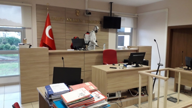 Zonguldak’ın Ereğli ilçe Adliyesinde Korona virüsüne karşı alınan tedbir ve önlemler her gün devam ediyor. Adliye binasında çalışan görevli memurlar gün içerisinde dezenfekte olarak hizmet verirken, akşam mesai bitiminde ise her akşam binada dezenfekte çalışması belediye ekiplerince yapılıyor.