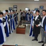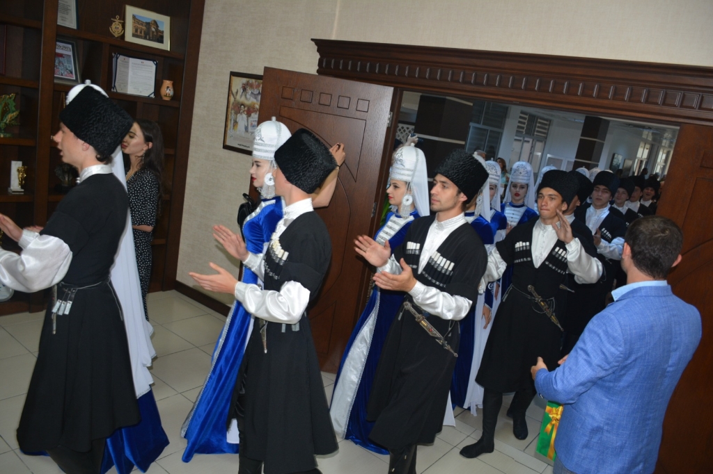 Merdivenlerden şarkılar söyleyerek çıkan halk dansları toplulukları, rengarenk giysileriyle koridorları doldurdu. Başkan Posbıyık, hepsiyle tek tek ilgilendi, başına kalpak taktı, sohbet etti.