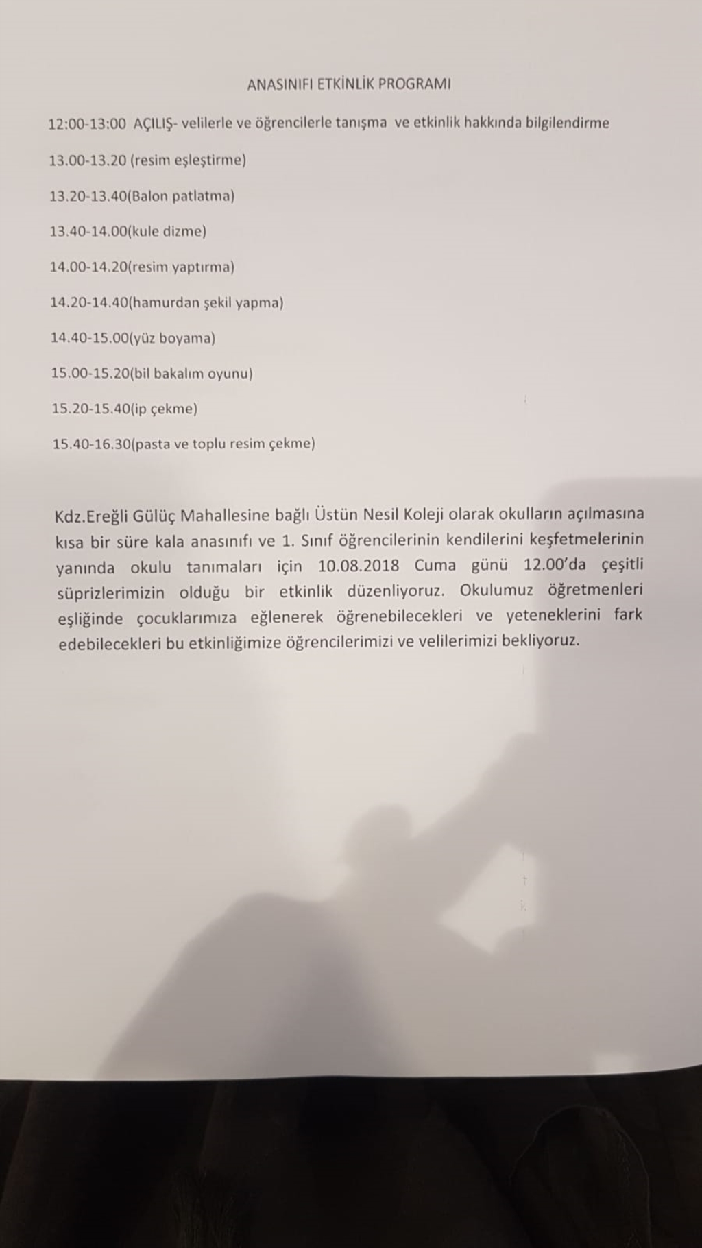 Konuyla ilgili olarak Üstün Nesil Koleji’nden yapılan açıklamada “Ereğli Gülüç beldesinde faaliyet gösteren Üstün Nesil Koleji olarak okulların açılmasına az bir zaman kala anasınıfı ve birinci sınıf öğrencilerinin kendilerini keşfetmeleri ve okulu tanımaları amacıyla 10 Ağustos 2018 Cuma günü okul bahçesinde saat 12.00’ de çeşitli sürprizlerimizin de olduğu bir etkinlik düzenliyoruz. Okulumuz öğretmenleri eşliğinde çocuklarımıza eğlenerek öğrenebilecekleri ve yeteneklerini fark edebilecekleri bu etkinliğimize öğrencilerimizi ve velilerimizi bekliyoruz” denildi.