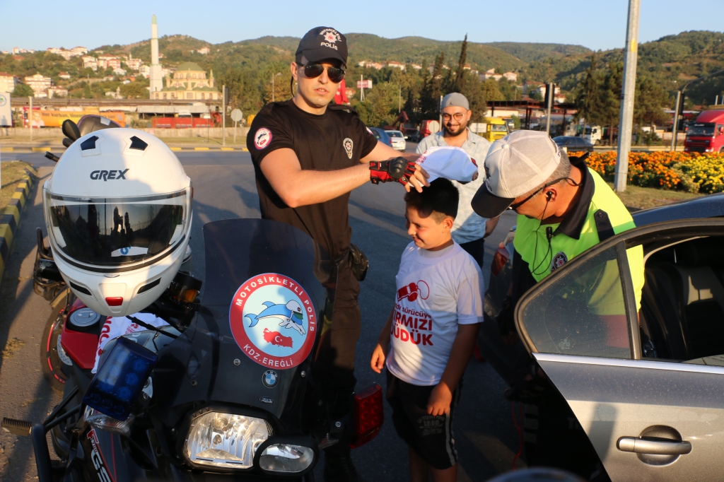 Zonguldak’ın Ereğli ilçesi Emniyet Müdürlüğü Trafik Tescil Büro Amirliği görevlileri ve Yunus Timi tarafından durdurulan sürücülere uyarı el ilanları verirken, çocuklara ise kırmızı düdük dağıttı.