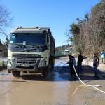 Kdz. Ereğli’de Askeri Limanın yapımına hafriyat taşıyan kamyonların yol açtığı çamur deryasından sonra Belediye Başkanı Halil Posbıyık ve halkın gösterdiği tepkinin ardından önlem alınmaya başlandı. Firma yetkililerinin Başkan Posbıyık’a yaptığı ziyaretin ardından Belediye, kamyonların yıkanması için şehir şebekesinden su hattı bağladı, kamyonlardaki çamurlar temizlenmeye başladı.