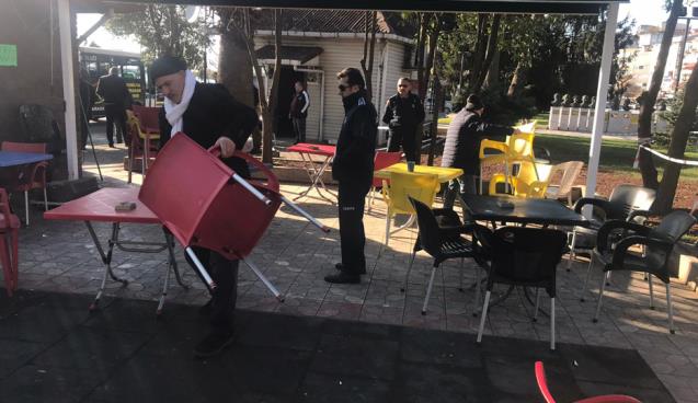 Ekipler İnönü parkındaki 2 çay ocağındaki vatandaşları kaldırarak masa ve sandalyeleri topladı.