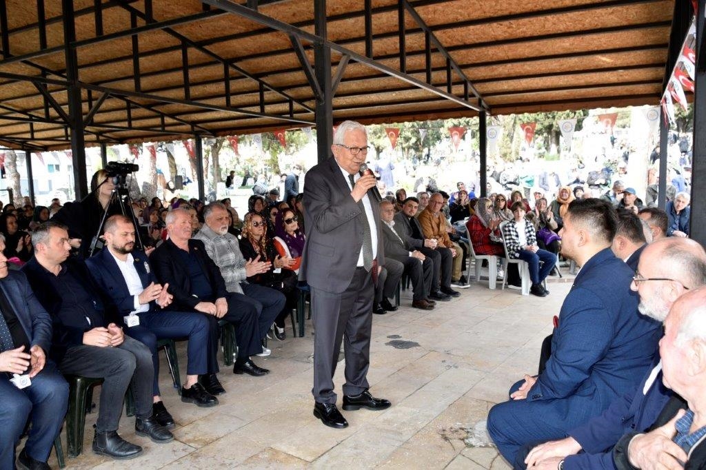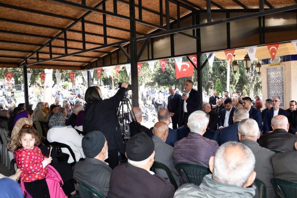 “Hepinize hoş geldiniz diyorum. 26 senedir Allah sağlık verdiği müddetçe hiç aralık vermeksizin bu geleneklerimizi devam ettiriyoruz. Bu Ramazan ayında da 94 yılından itibaren yaptığımız gibi 3 kap sıcak yemeği evlerimize gönderdik. Ayrıca tatlı gönderdik. İhtiyaç sahiplerimizi yalnız bırakmadık. Gıda kolilerini gönderdik. Mezarlıklarımızı temizledik. Bizim için mezarlıklarımızın temiz ve bakımlı olması son derece önemli. Yine 100 bin metrekare alanda Belen’de kurduğumuz ve yapmaya devam ettiğimiz büyük mezarlıkta şehitler mezarı yapılmaya devam ediyor. Orada da ücretsiz olarak defin işlerine başladık. Allah razı olsun diyenlere bende onlara Allah razı olsun diyorum. Bizim için dua etmeleri yeterli. Bu Ramazan ayında oruçlarınızı tuttunuz, namazlarınızı kıldınız, dualarınızı ettiniz, Allah kabul etsin diyorum. İnşallah bir dahaki senede hiç eksiksiz, sağlık, sıhhat içerisinde bir dahaki bayramlarda bir arada olmayı Allah bizlere nasip etsin. Çoluk çocuğunuzla birlikte bayramınız güzel geçsin. Bugün yine iki noktada mezarlıklara dikmeniz için 30 bin çiçek fidesi dağıtıyoruz. Bunlar bir gelenek. Bizde bu dünyadan göçtüğümüz zaman inşallah arkamızdan gelenler bu gelenekleri devam ettirirler diyorum, herkese iyi bayramlar diliyorum, Allah Kurban Bayramı’na erişmeyi nasip etsin. Hocalarıma şükranlarımı sunuyorum.”