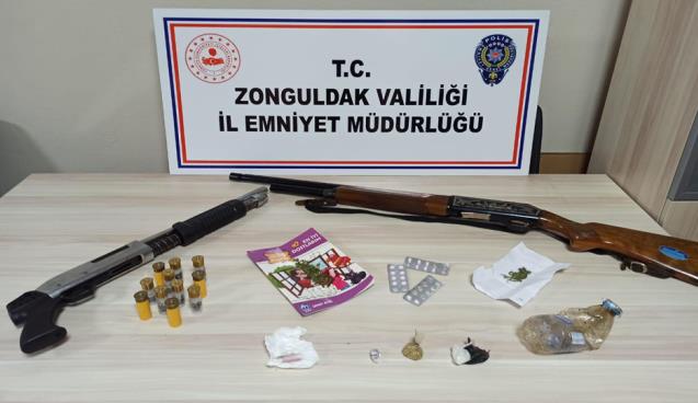 İl Emniyet Müdürlüğü Narkotik Suçlarla Mücadele Grup Amirliğince düzenlenen operasyonda K.S. isimli şahsın ikametinde, 4.92 gr metamfetamin, 3 adet ecstasy, 16 adet sentetik ecza, 6.72 gram toz esrar, 5.65 gresrar, 3.10 gram esrar, 1 adet ruhsatsız pompalı tüfek, 1 adet ruhsatsız Av tüfeği, 11 adet fişek ele geçirildi. B.T ve M.Ö isimli şahıslar gözaltına alınarak polis merkezine getirildi