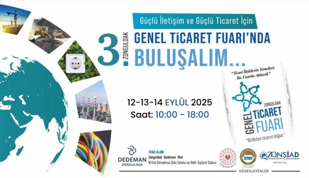 Zonguldak Genel Ticaret Fuarı 12-13-14 Eylül 2025 tarihinde saat: 10.00-18.00’de Zonguldak Dedeman Otel’de gerçekleştirilecek.