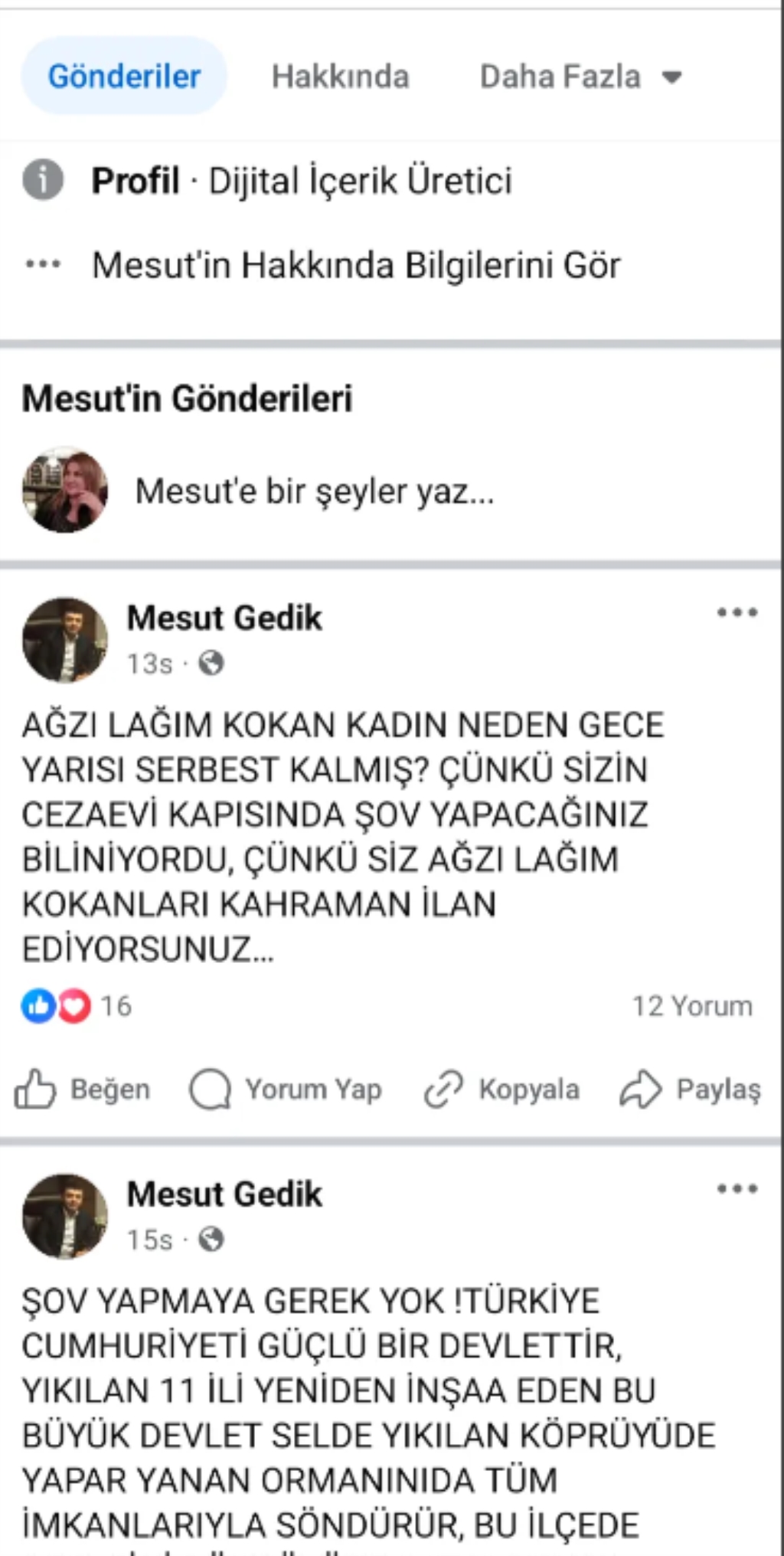 Zonguldak'ın Devrek ilçesine bağlı Bakırcılar Köyü Muhtarı Mesut Gedik, sosyal medya hesabından Dilruba Kayserilioğlu'nun tahliye edilmesini "Ağzı lağım kokan kadın neden gece yarısı serbest kalmış? Çünkü sizin cezaevi karşısında şov yapacağınız biliniyordu. Çünkü siz ağzı lağım kokanları kahraman ilan ediyorsunuz" diye sert eleştirdi.