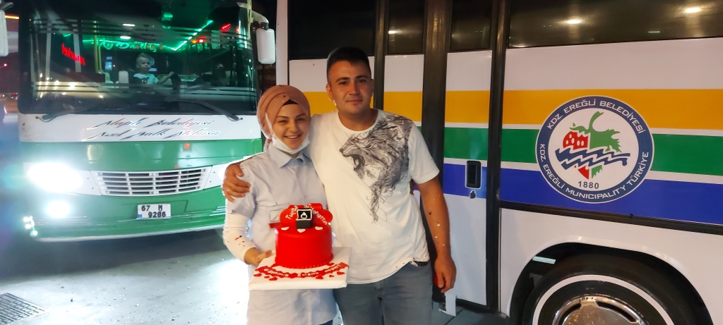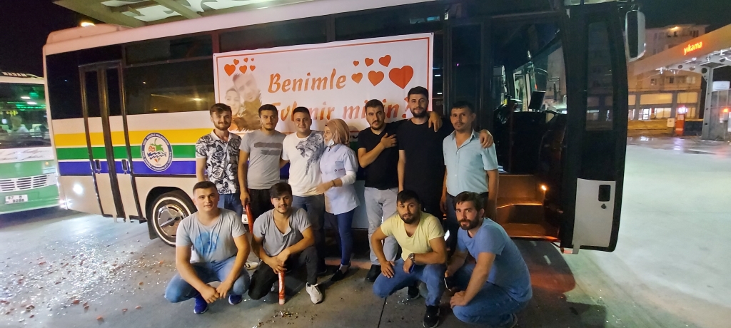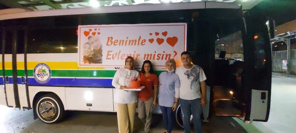 Ereğli’ de yaklaşık 6 yıldır Halk otobüsünde şoförlük yapan Sebahattin Temel, 1 yıldır birlikte olduğu Tuğba Çetin’e unutamayacağı bir evlilik teklifi hazırladı. Tuğba Çetin’in çalıştığı Çilek Akaryakıt istasyonuna kornalarla giriş yapan Sebahattin Temel, marketten dışarıya çıkan sevdiği Tuğba Çetin’e evlilik teklifinde bulundu. Sabahattin Temel’i ve otobüste asılı olan ‘Benimle Evlenir Misin’ yazılı pankartı görünce şoka girdi. Sabahattin Temel otobüs kornaları eşliğinde otobüsünden inerek, Tuğba Çetin’e evlenme teklifinde bulundu. Evlilik teklifini kabul eden Tuğba Çetin ‘ Böyle bir şey beklemiyordum’ ifadelerini kullanarak şaşkınlığı gizleyemedi.