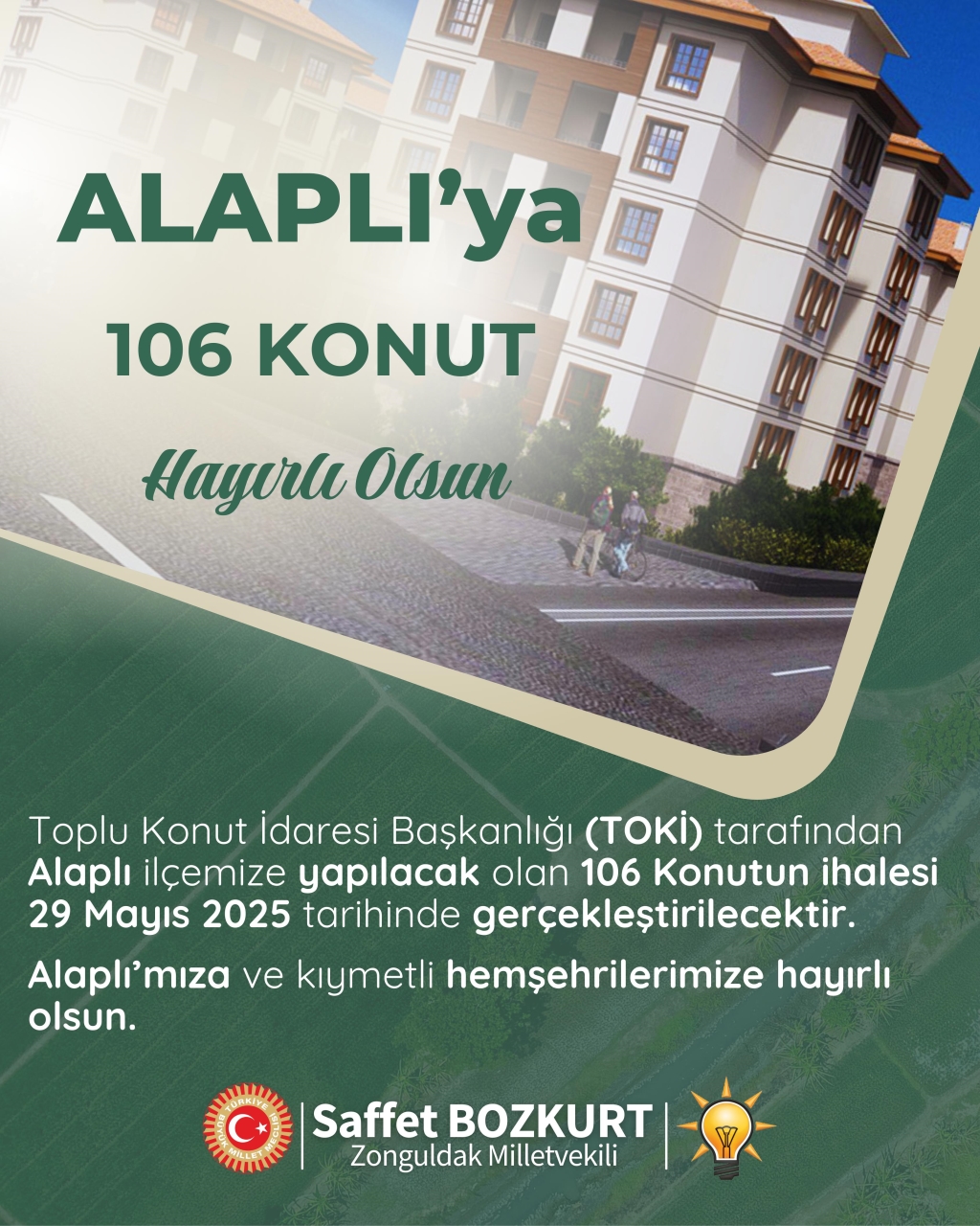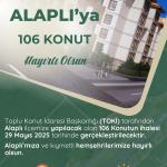 Alaplı’ya 106 konut Hayırlı Olsun... Toplu Konut İdaresi Başkanlığı (TOKİ) tarafından Alaplı ilçemize yapılacak olan 106 Konutun ihalesi 29 Mayıs 2025 tarihinde gerçekleştirilecektir. Alaplı’mıza ve kıymetli hemşehrilerimize hayırlı olsun.