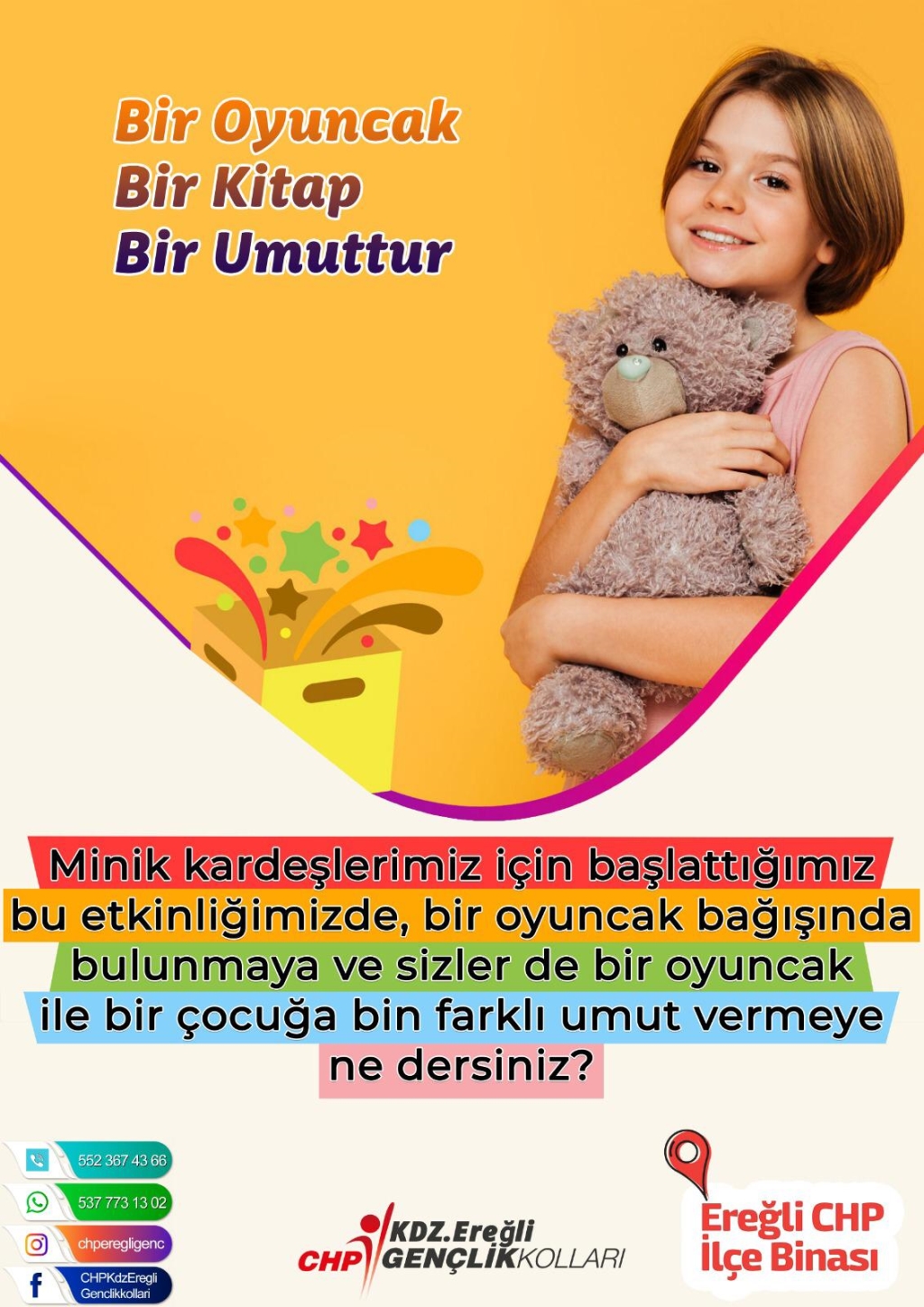 Ereğli Cumhuriyet Halk Partisi Gençlik kolları tarafından çocuklar için Kitap ve oyuncak kampanyası başlatıldı. Kampanyaya katılmak isteyenlerin kitap ve oyuncakları Orhanlar Mahallesi Süleyman Seba sokak üzerinde bulunan Cumhuriyet Halk Partisi ilçe binasına getirerek teslim edebilecekleri ifade edildi.