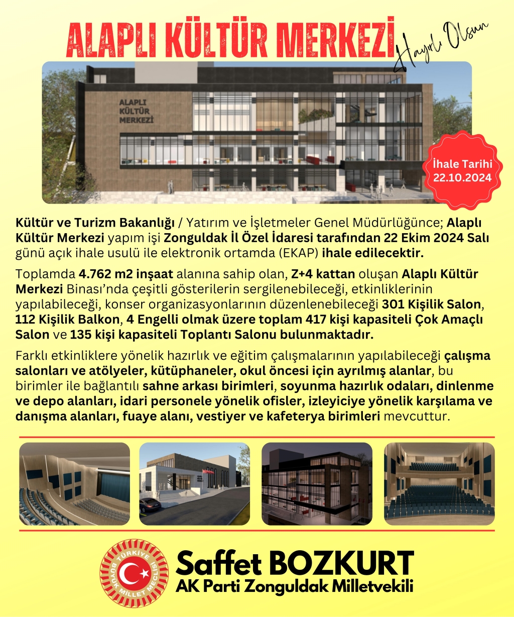 Kültür ve Turizm Bakanlığı / Yatırım ve İşletmeler Genel Müdürlüğünce; Alaplı Kültür Merkezi yapım işi Zonguldak İl Özel İdaresi tarafından 22 Ekim 2024 Salı günü açık ihale usulü ile elektronik ortamda (EKAP) ihale edilecektir.