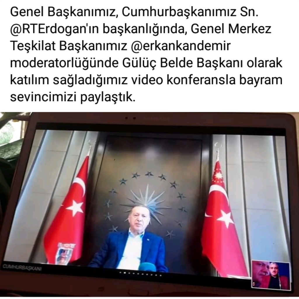 Ak Parti Gülüç belde Başkanı İsmail Yılmaz, Ak Parti Teşkilat Başkanı Erkan Kandemir’in operatörlüğünde, telekonferans sistemi ile Cumhurbaşkanı Recep Tayyip Erdoğan ile Bayramlaşma programına katıldı. Konuyla ilgili olarak açıklamada bulunan Ak Parti Gülüç belde başkanı İsmail Yılmaz “Genel Başkanımız, Cumhurbaşkanımız sayın Recep Tayyip Erdoğan’ın başkanlığında, Genel Merkez teşkilat başkanımız Sayın Erkan Kandemir Moderatörlüğünde Gülüç Belde Başkanı olarak katılım sağladığımız video konferansla bayram sevincini yaşadık” dedi.