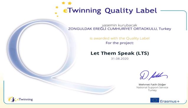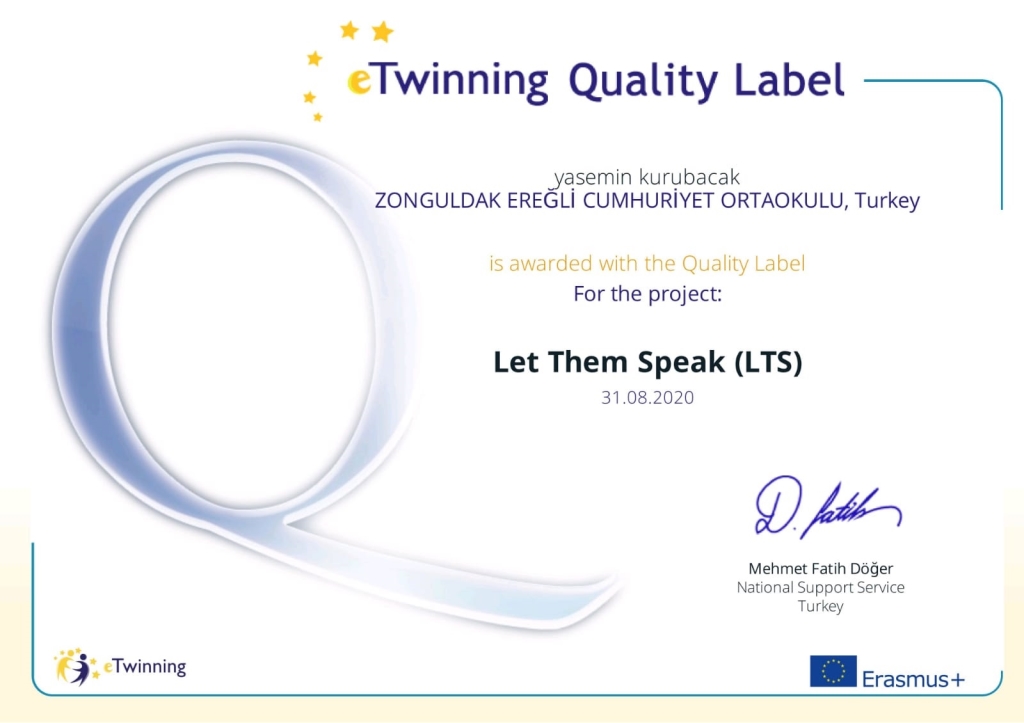 Zonguldak’ın Ereğli İlçesindeki Cumhuriyet Ortaokulu’nun, Avrupa ülkeleri arasında sürdürülen E-Twinning Projesi kapsamında, “Bırak Konuşsunlar (Let Them Speak)” Projesi ile “Ulusal Kalite Etiketi” alma hakkı elde ettiği öğrenildi.