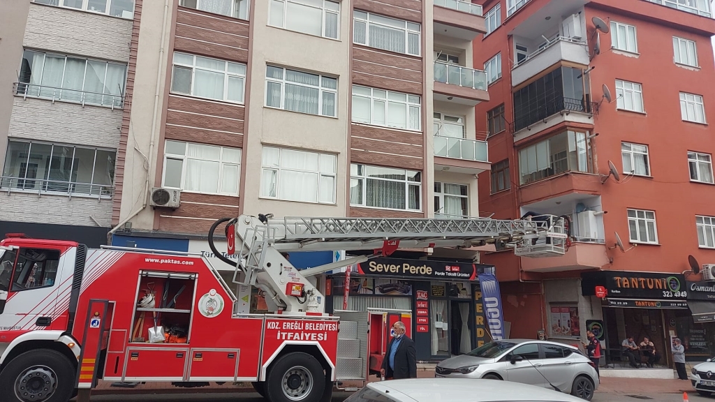 Zonguldak’ın Ereğli ilçesinde İtfaiye ekiplerince Erdemir Caddesi üzerinde çatılardan parça düştüğü ihbarı üzerine çevrede çalışma yaptı.