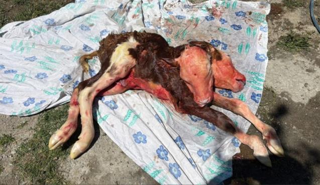 Bartın'ın Karainler köyünde, Mustafa Yaman'a ait inekten sezaryenle alınan çift başlı buzağı ölü doğdu.