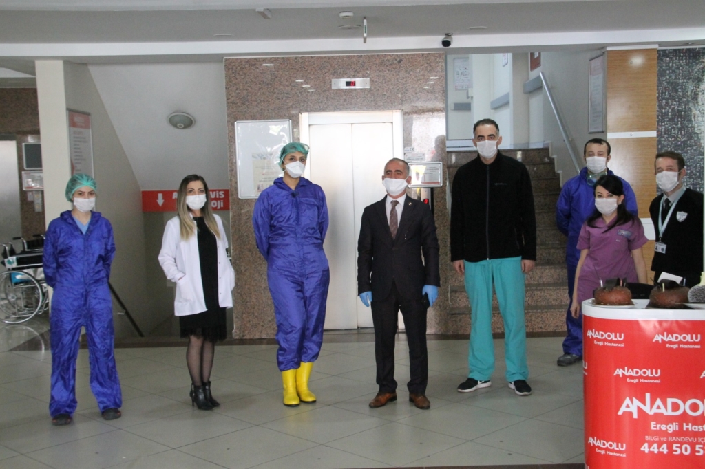 Doğum gününde taburcu olan İsmail Çetin’e eşi, iş arkadaşları, Ereğlili iş adamları Firuz Yılmaz, İlkay Özcan ve Kimsesiz Ömer ve hastane çalışanları tarafından 3 ayrı pasta kesildi. Pasta kesiminin ardından açıklamada bulunan İsmail Çetin “Bir gribal enfeksiyon vücutta bir kırgınlık oluştu. Bunun üzerine hastaneye başvurdum. Hastane çalışanları o kadar temkinliler ki, son günlerde ki Koronavirüs ile ilgili, inanın polis baskını olsa böyle gözaltına alınırdım. Başta çok kızmıştım. Ben kendimi biliyordum. Ancak hastane çalışanlarının bu dikkati çok etkiledi. Beni 15 dakika içerisinde tetkiklerimi yapıp odama aldılar. Benimle çok iyi ilgilendiler. Başta doktorumuz Sarıyya hanım olmak üzere hemşirelerimize teşekkür ediyorum. Kötü olaylar çok çabuk duyuluyor. Hastane Genel Müdürü Şahin Elçi bey, Hastane yönetim kurulu başkanı Hayati Arkaz, Kaymakamımız Sayın İsmail Çorumluoğlu, Belediye başkanımız Sayın Halil Posbıyık, Ak Parti Zonguldak Milletvekilimiz Sayın Polat Türkmen, hepsi aradılar ve durumumla ilgili birebir ilgilendiler. Bu arada doktorumun bana verdiği moral üst düzeydeydi. Bana bende bu hastalık çıksa bile yenersin sözleri bana büyük moral oldu. Anadolu’da hayat var diyorum” dedi.