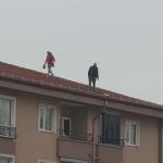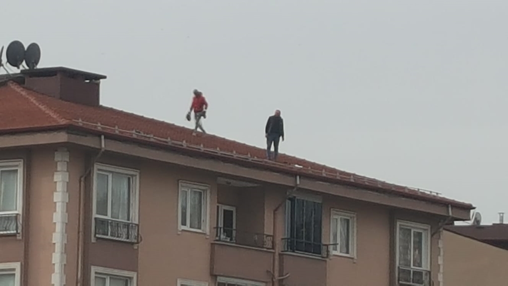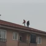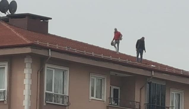 Zonguldak’ın Ereğli ilçesinde iki işçinin şiddetli fırtınaya rağmen çatıda yaptıkları çalışma cep telefonu ile görüntülendi.