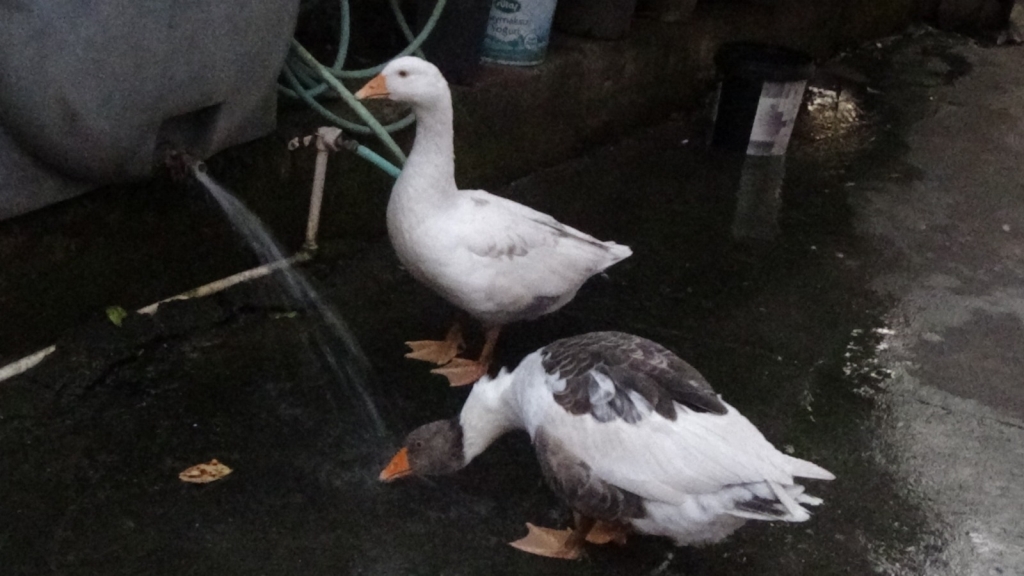 Zonguldak’ın Ereğli ilçesine bağlı Yazıcılar köyünde yaşayan Hanife Balaban’ın Limon ve Portakal isimli Kazları, susuzluklarını gagaları ile açtıkları musluktan suyu içerek gideriyorlar.
