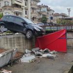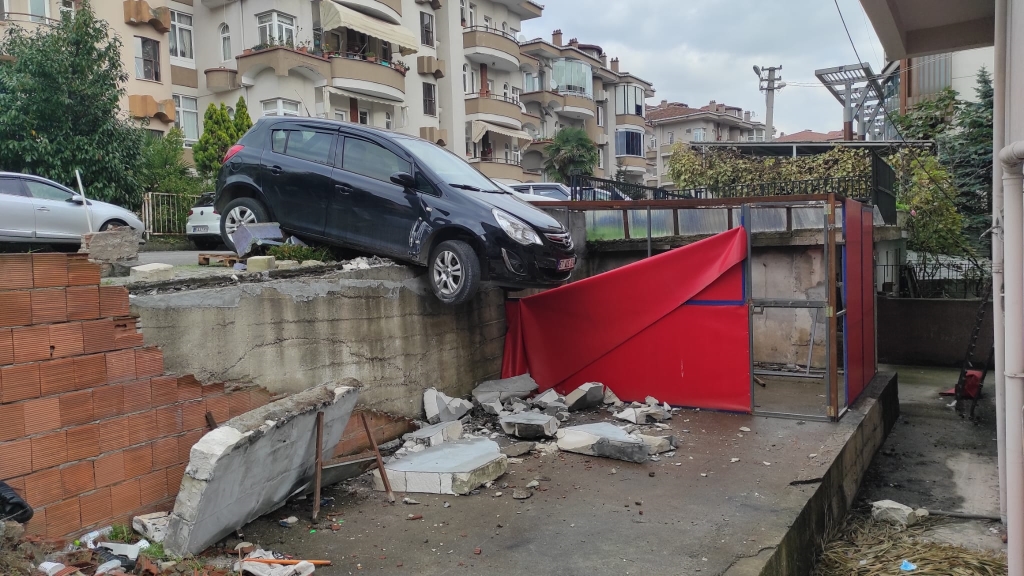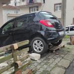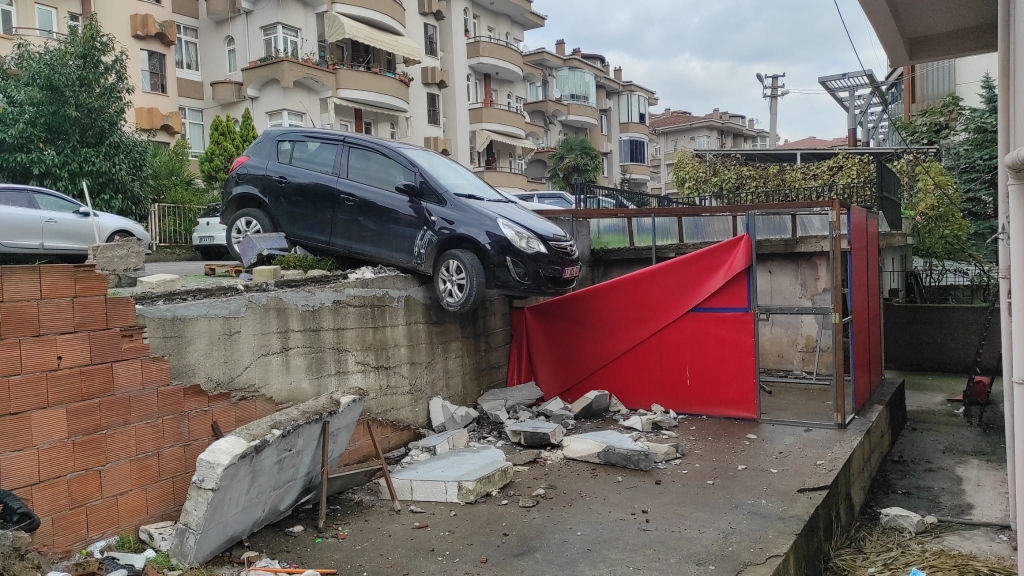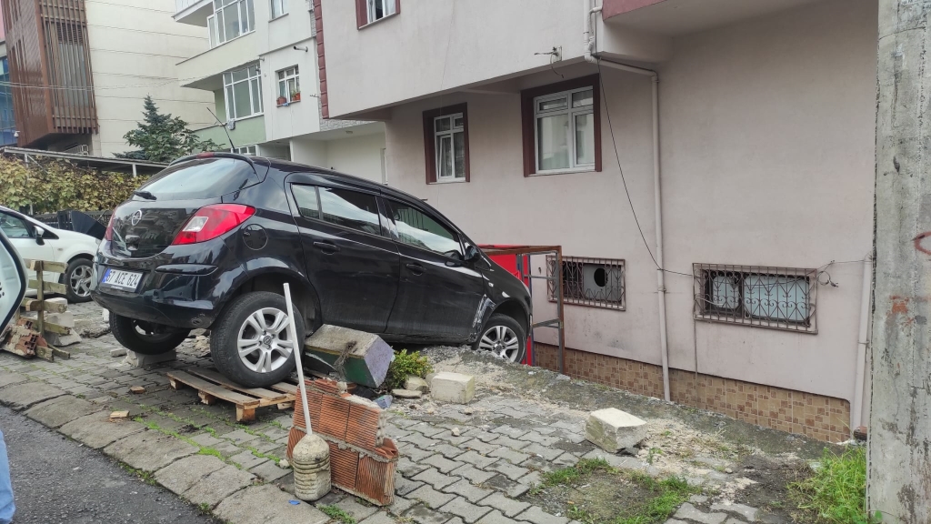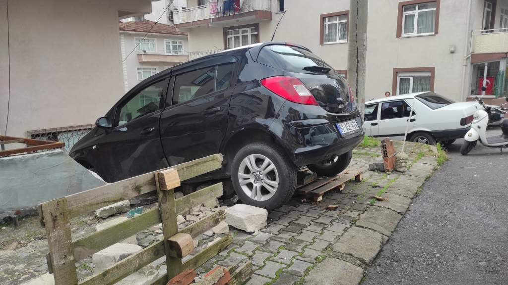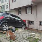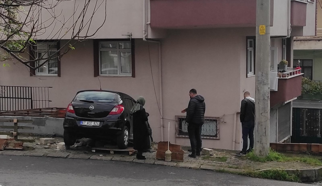 Zonguldak’ın Ereğli ilçesinde kadın sürücü aracını park ettiği sırada fren yerine gaza basması sonucu binanın duvarını yıkarak askıda kaldı.
