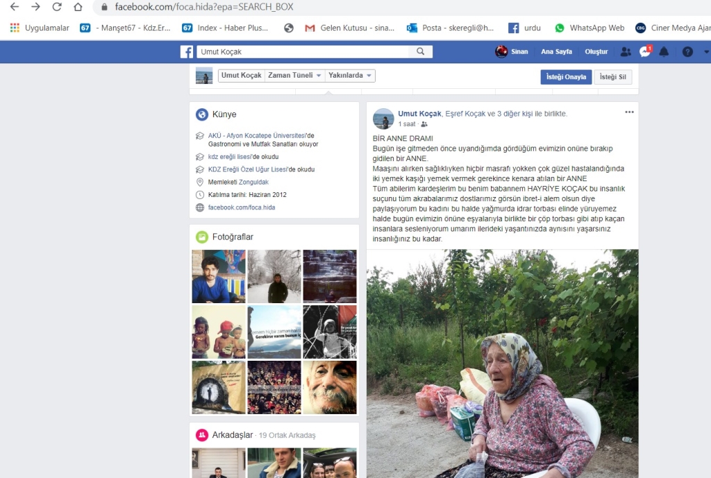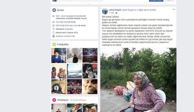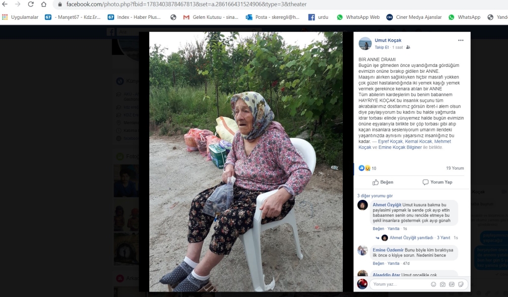Koçak paylaşımında “Bugün işe gitmeden önce uyandığımda gördüğüm evimizin önüne bırakıp gidilen bir ANNE. Maaşını alırken sağlıklıyken hiçbir masrafı yokken çok güzel, hastalandığında iki yemek kaşığı yemek vermek gerekince kenara atılan bir ANNE. Tüm abilerim, kardeşlerim. Bu benim babaannem HAYRİYE KOÇAK. Bu insanlık suçunu tüm akrabalarımız dostlarımız görsün, ibret-i alem olsun diye paylaşıyorum. Bu kadını bu halde yağmurda idrar torbası elinde, yürüyemez halde bugün evimizin önüne eşyalarıyla birlikte bir çöp torbası gibi atıp kaçan insanlara sesleniyorum. Umarım ilerideki yaşantınızda aynısını yaşarsınız. İnsanlığınız bu kadar”
