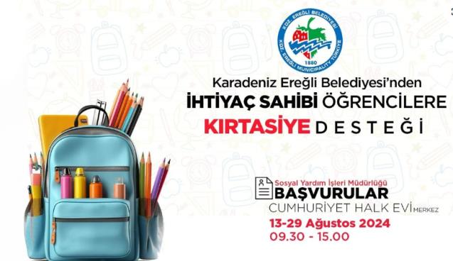 Kdz. Ereğli Belediyesi, 2024-2025 eğitim ve öğretim dönemi öncesinde, ihtiyaç sahibi ailelerin çocuklarına kırtasiye yardımında bulunacak.