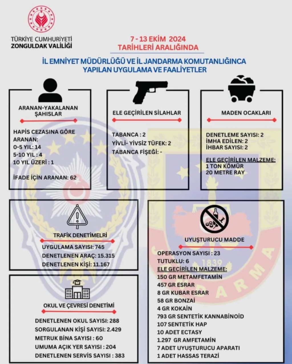 Zonguldak Valiliği il genelinde 7-13 Ekim 2024 tarihleri arasında, gerçekleştirilen operasyonları paylaştı.