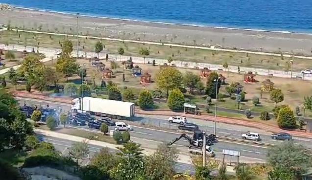 Zonguldak'ın Kozlu Sahil Yolu'nda iş makinesi ile yolu kesen trafik canavarı, 20 dakika trafiği kilitledi.