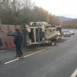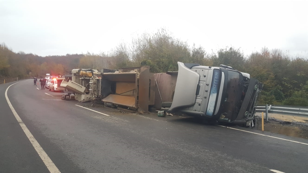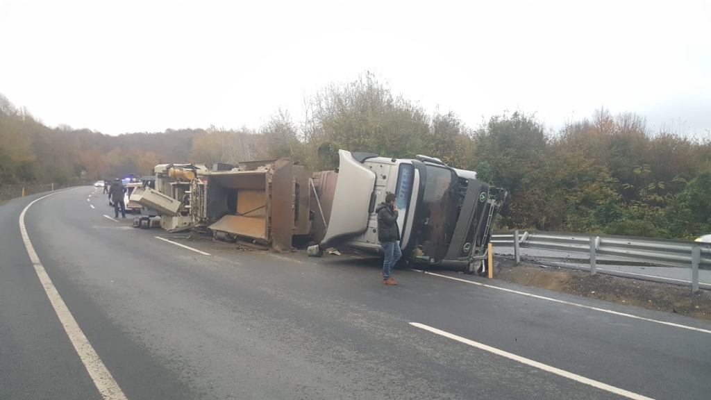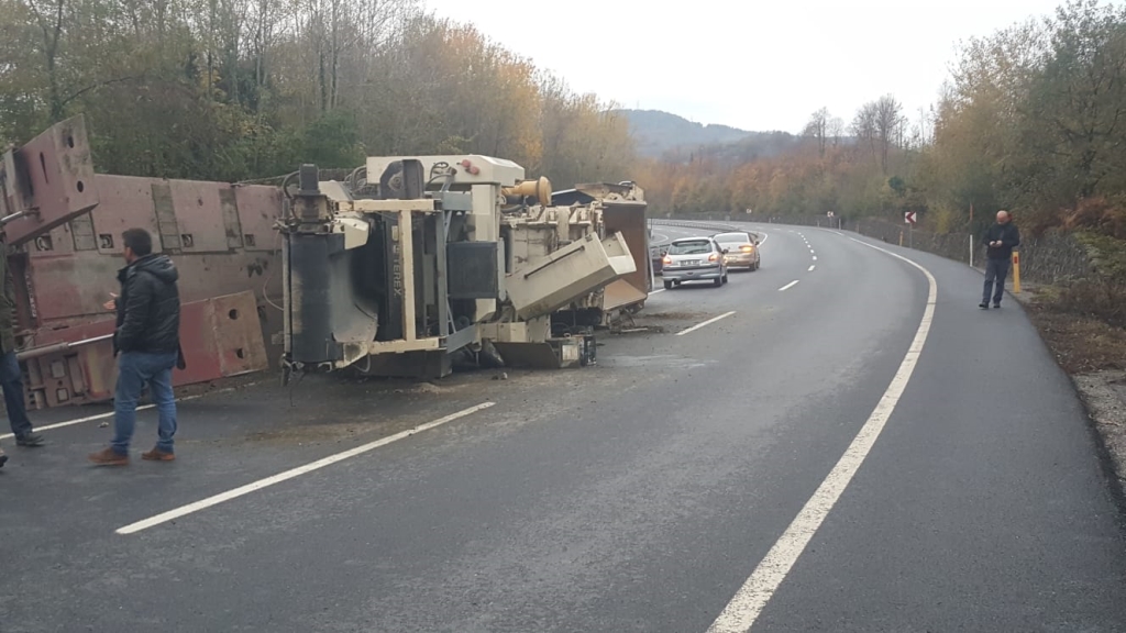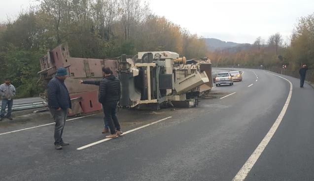 Zonguldak’ın Ereğli ilçesinde iş makinesi taşıyan TIR devrildi. Kazada yaralanan olmazken TIR ve taşıdığı iş makinesinde hasar meydana geldi.