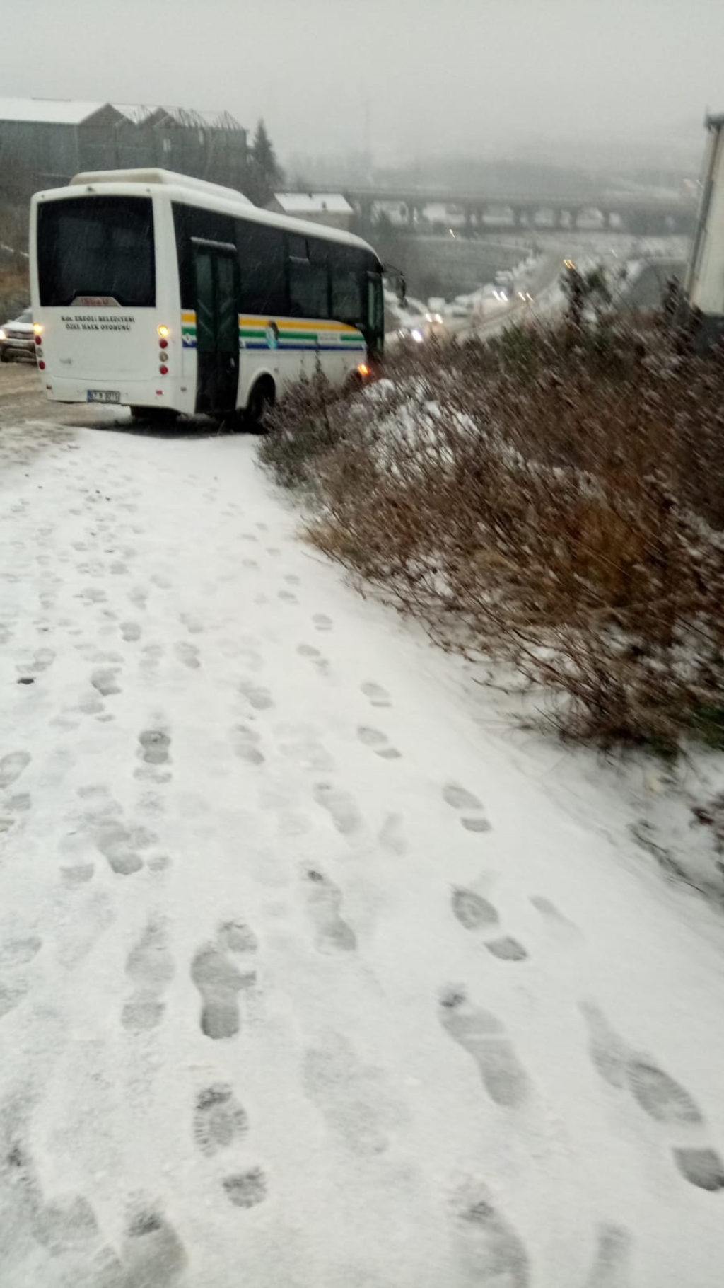 İkinci kaza Kepez Mahallesi’nde meydana geldi. İddiaya göre karda sürücüsünün direksiyon hâkimiyetini kaybettiği halk otobüsü kaldırma çarparak durabildi. Kazada yaralanan olmazken araçta maddi hasar oluştu.