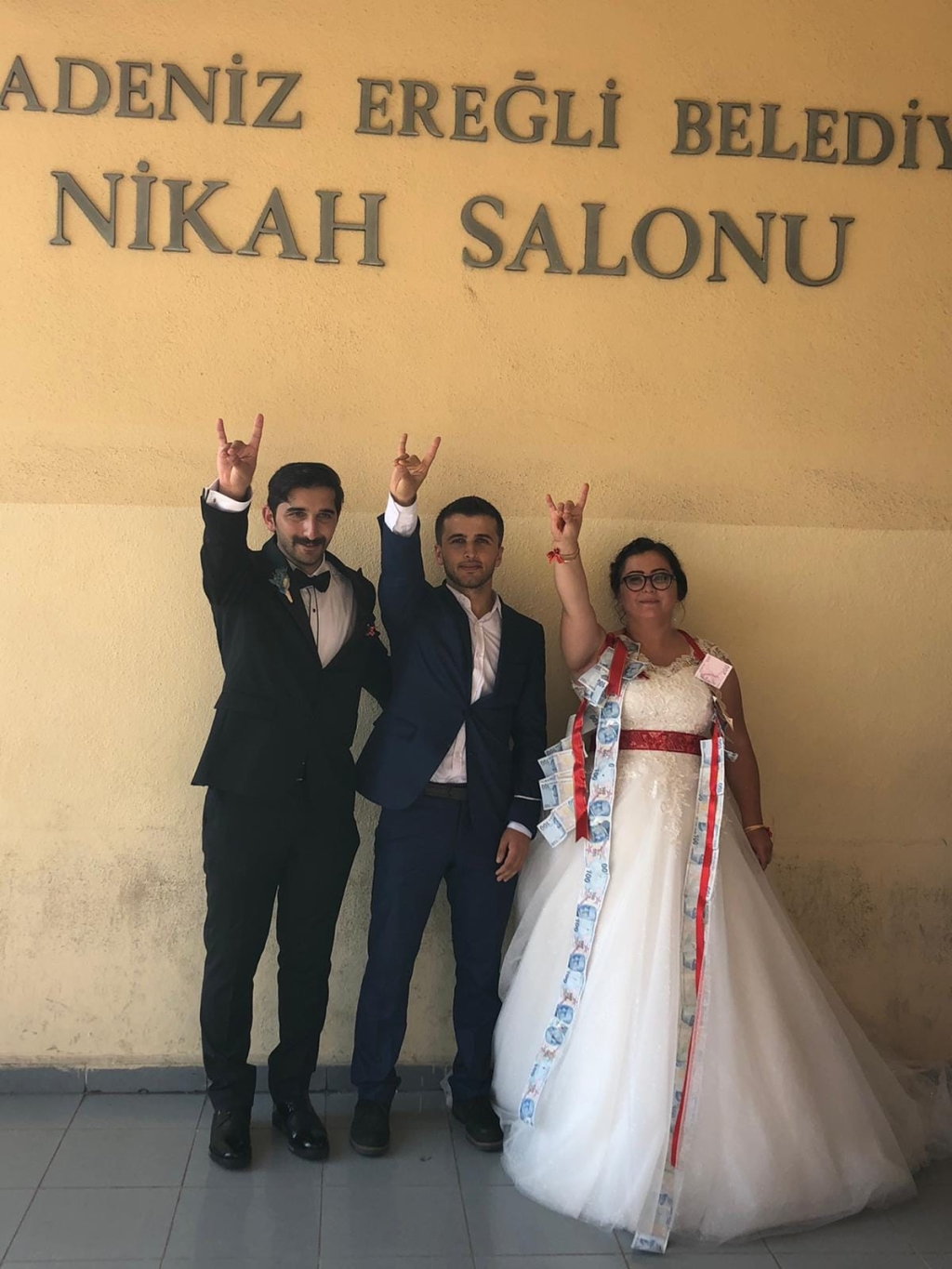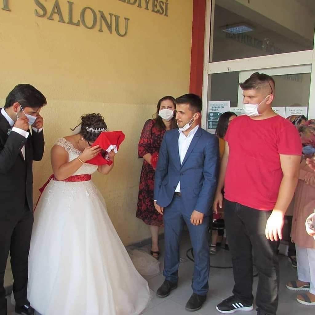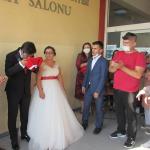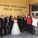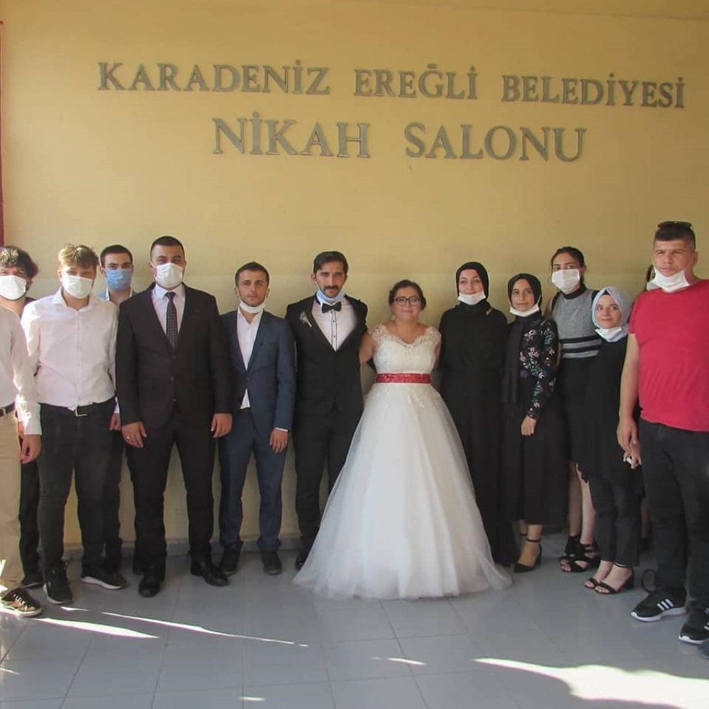 Nikâh akdinin ardından genç çift nikaha katılanlarla hatıra fotoğrafı çektirdi.