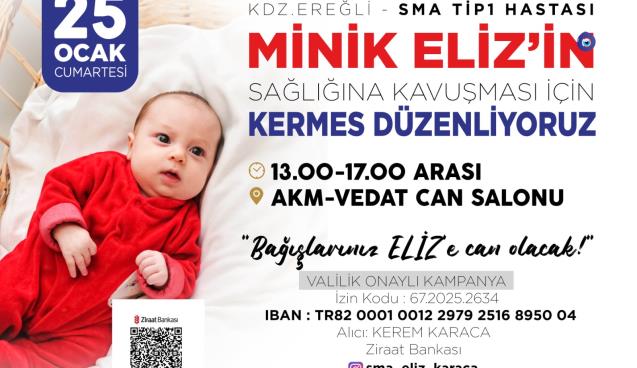 25 Ocak 2025 Cumartesi SMA TİP 1 Hastası Minik Eliz’in sağlığına kavuşması için kermes düzenleniyor.